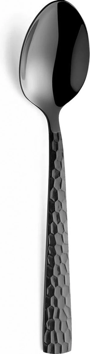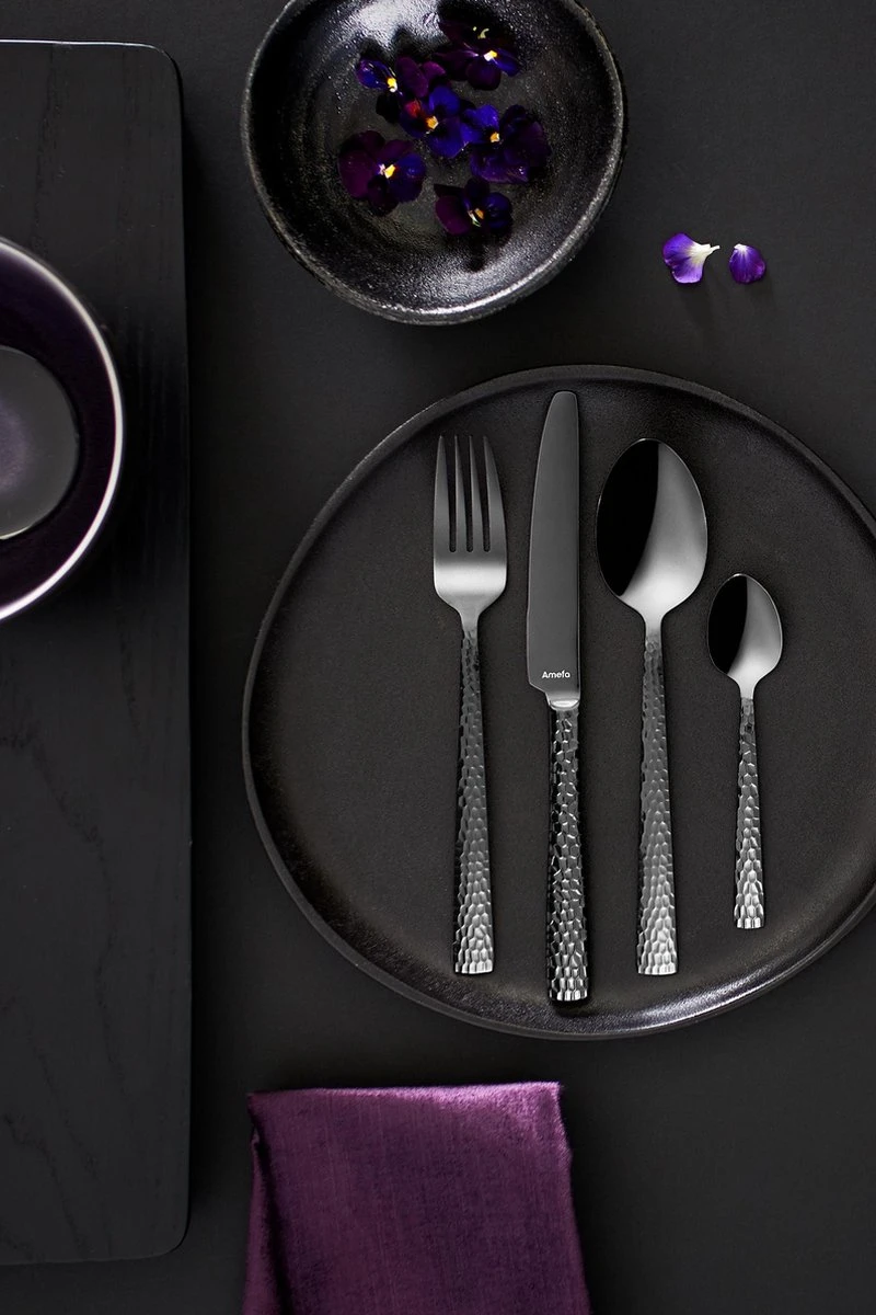 Felicity brengt het gevoel van eigentijds handwerk op tafel door de grove, gehamerde decoratie op het heft. De combinatie van een hoogglans afwerking met een stoere zwarte kleur geeft een stijlvolle en moderne twist aan elke tafelsetting. De gehamerde afwerking op de hendel zorgt voor een mooie reflectie op het bestek waarbij de glans perfect tot zijn recht komt.