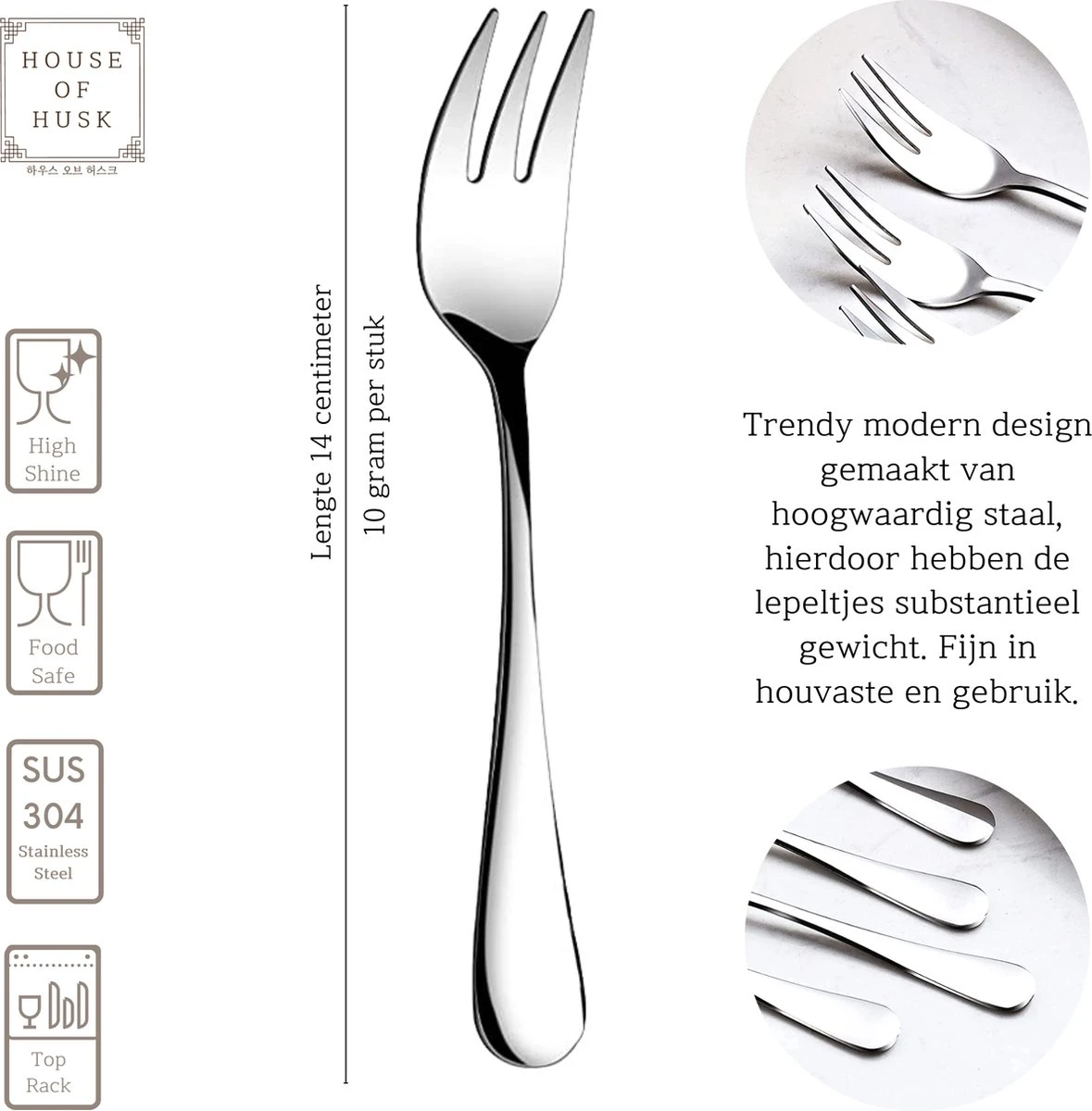 Al ons House of Husk™ bestek wordt gemaakt van kwaliteit 304 roestvast staal. Ondanks het slanke design van het bestek ligt het bestek fijn in de hand door de dichtheid van het staal, wat voor een fijn gewicht zorgt. Ons bestek kan in de vaatwasser. LET OP: Mocht u ervoor kiezen om ons bestek te wassen in een vaatwasser, kies hiervoor een programma met een temperatuur niet hoger dan 40ºC en een zacht tot mild reinigingsmiddel (fosfaatgehalte van max. 3%, zuur kan bijten in het bestek). Om de afwerking van onze producten zolang mogelijk mooi te houden, raden wij handwas aan, zonder schuursponsjes, bleekmiddelen en soda.